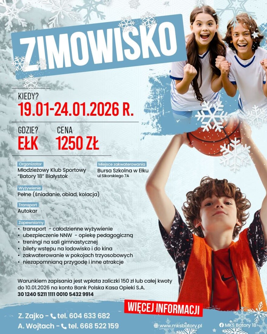 Młodzieżowy Klub Sportowy "Batory 18" Białystok zapraszamy wszystkich chętnych na niezapomnianą zimową przygodę pełną sportu, ruchu i dobrej zabawy!